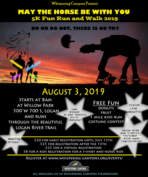 This is a Fun Run of all ages. Come dressed as your favorite Sci-fi character. The run will start at the beautiful Wookland Park in Logan, Utah at 8am and proceed through the beautiful Logan River Trail. Please arrive 30 minutes early for check-in. Each registration includes a t-shirt and horse ride at Whispering Canyons.
